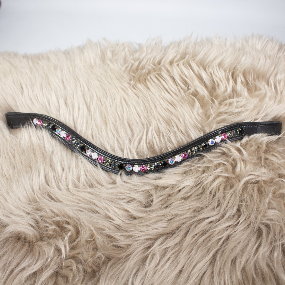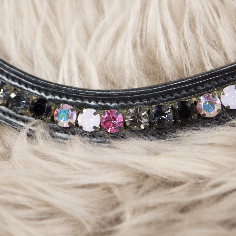 Der Stirnriemen ist aus schwarzem Leder gefertigt und geschwungen geschnitten. Das Stirnband hat Größe COB. Der Stirnriemen hat leichte Gebrauchsspuren.