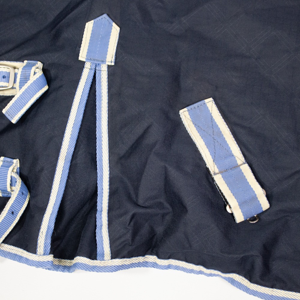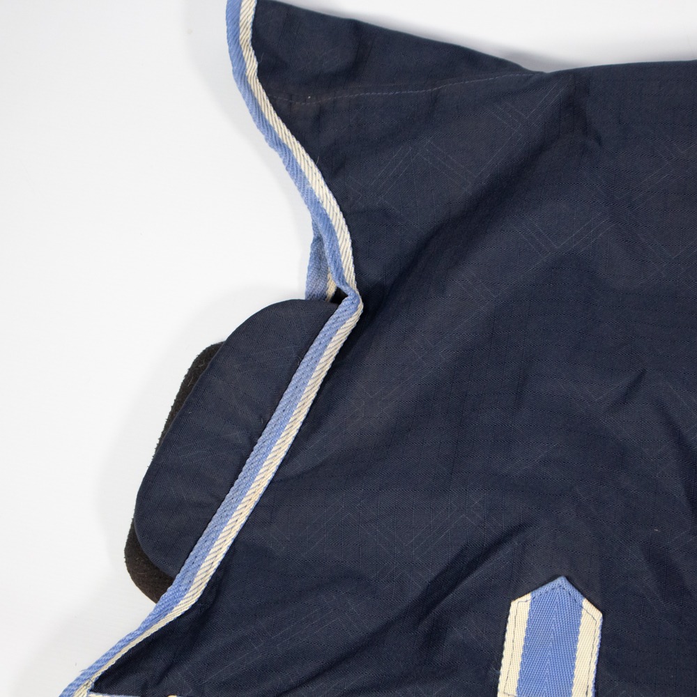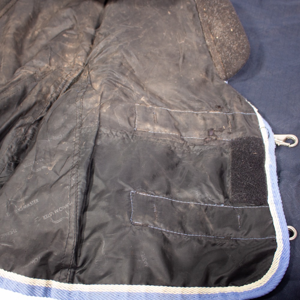 Die Outdoordecke von Thermo Master hat eine Rückenlänge von 85 cm. Sie hat eine Kreuzbegurtung, Gehfalten, Beingurte, einen Schweifriemen und einen Schweiflatz. Die Decke hat Gebrauchsspuren.