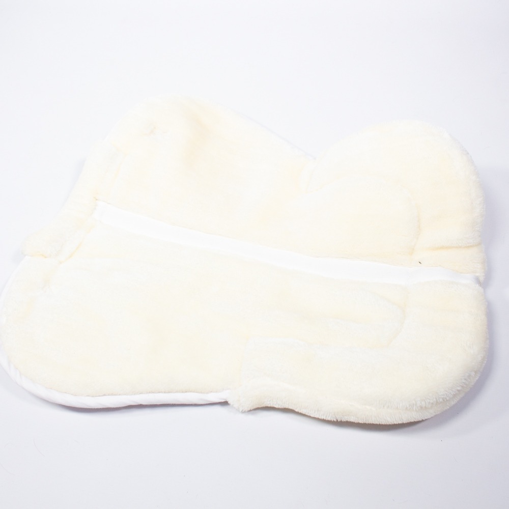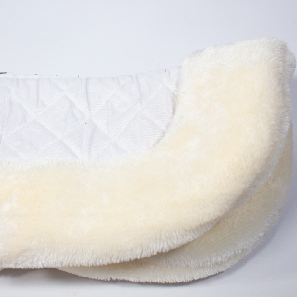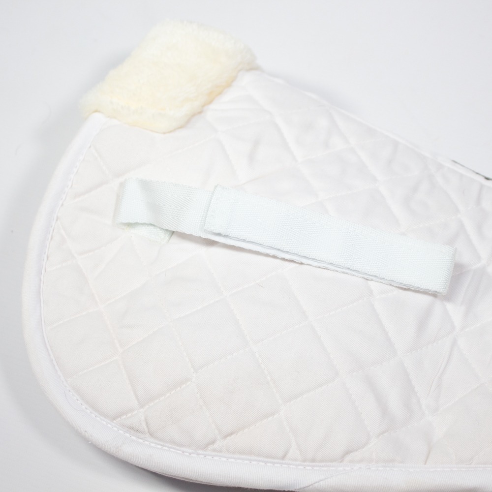 Das Sattelkissen von USG hat eine Stoffoberseite und eine Unterseite aus Kunstfell. Die Sattelunterlage hat vorne und hinten einen Fellrand. Es hat eine Einheitsgröße und ist weiß. Das Pad ist so gut wie neu.