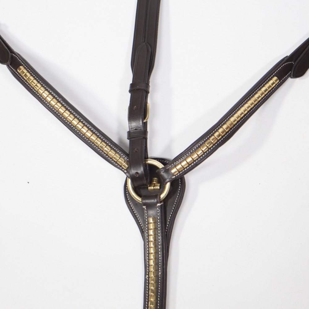 Das Vorderzeug ist braun und hat Größe Warmblut. Das Vorderzeug hat leichte Gebrauchsspuren.