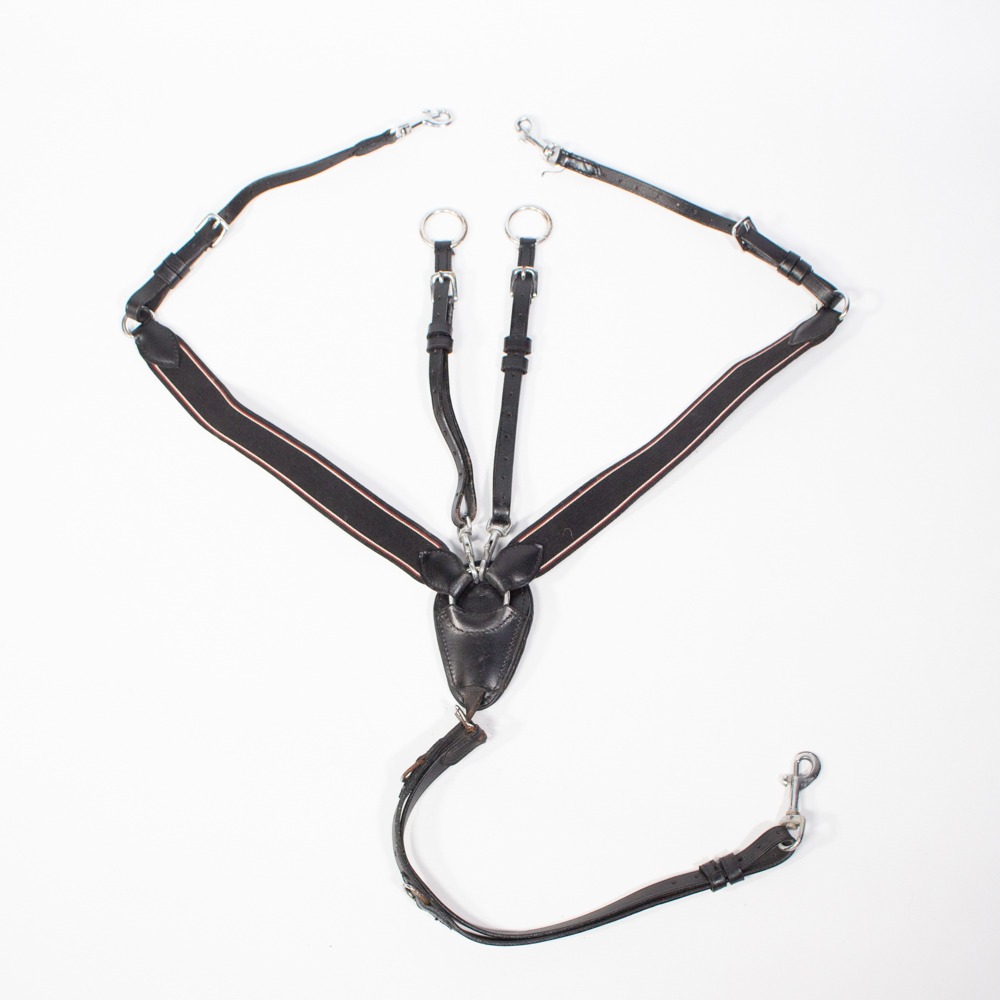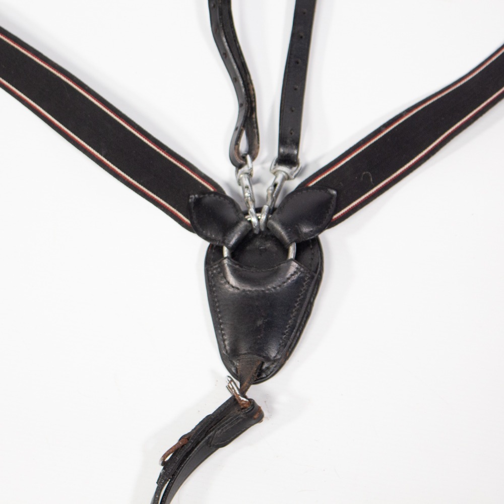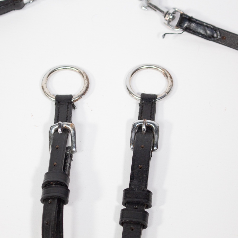 Das Vorderzeug ist individuell einstellbar und schwarz. Das Vorderzeug hat silberne Beschläge und Größe Pony. Das Vorderzeug hat Gebrauchsspuren.
