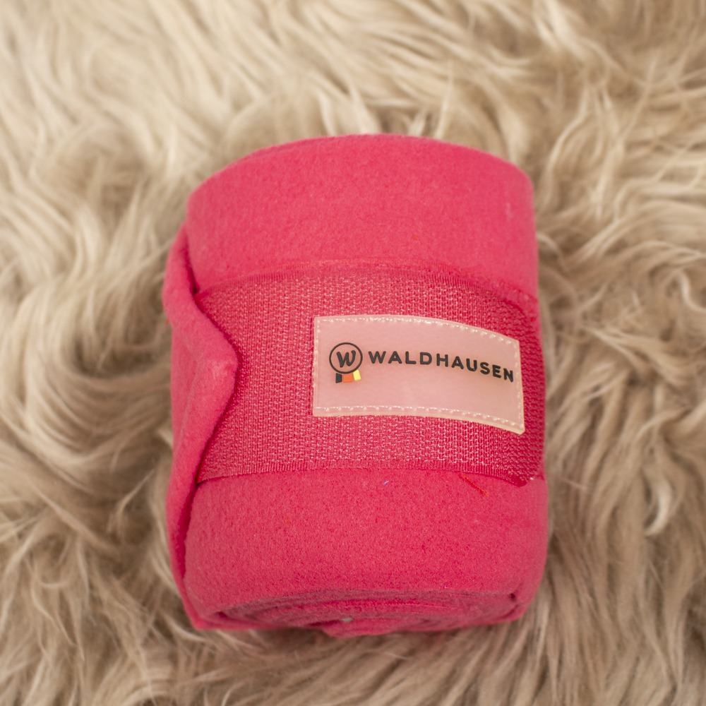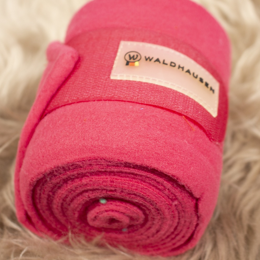 Die Bandagen von Waldhausen haben Größe Warmblut, sind pink und kommen im 4er Set. Die Bandagen haben leichte Gebrauchsspuren.