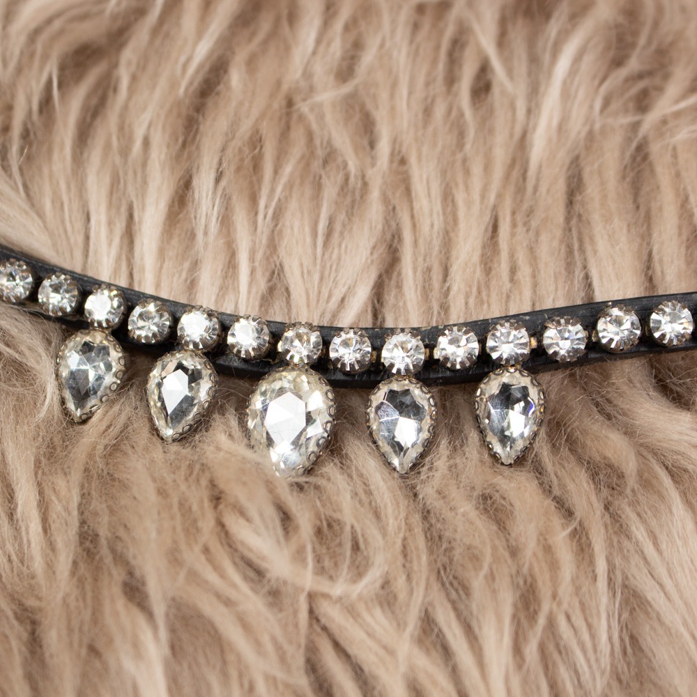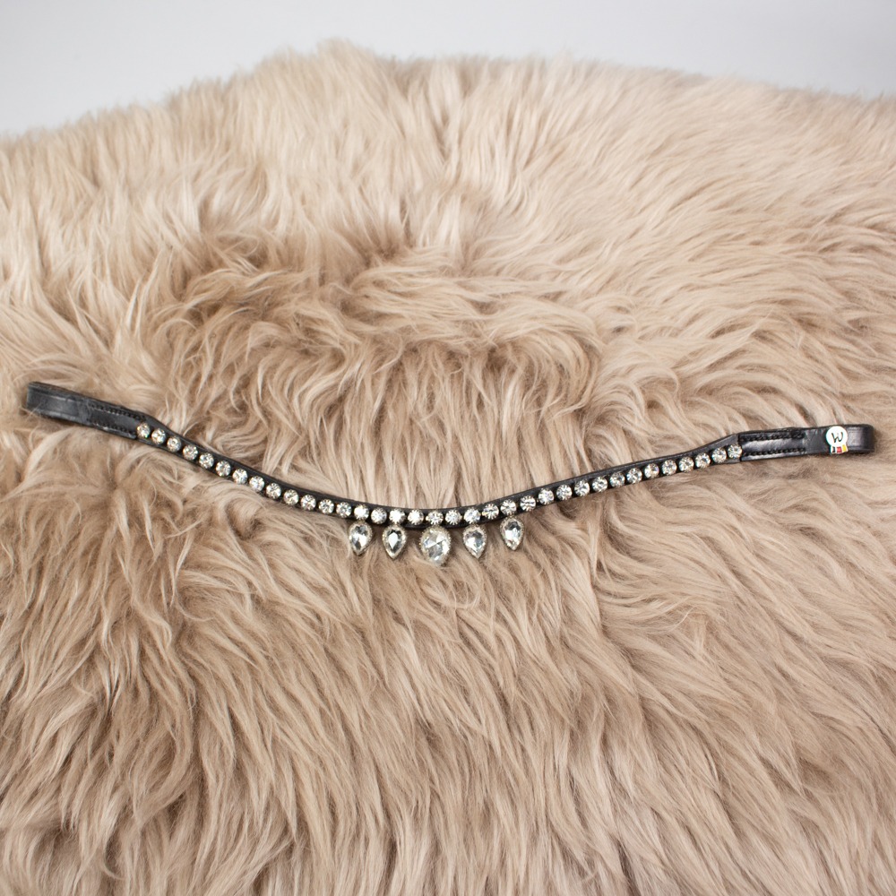 Der Stirnriemen von Waldhausen ist aus schwarzem Leder gefertigt und geschwungen geschnitten. Das Stirnband hat Größe Pony und weiße Glitzersteine. Der Stirnriemen hat leichte Gebrauchsspuren.